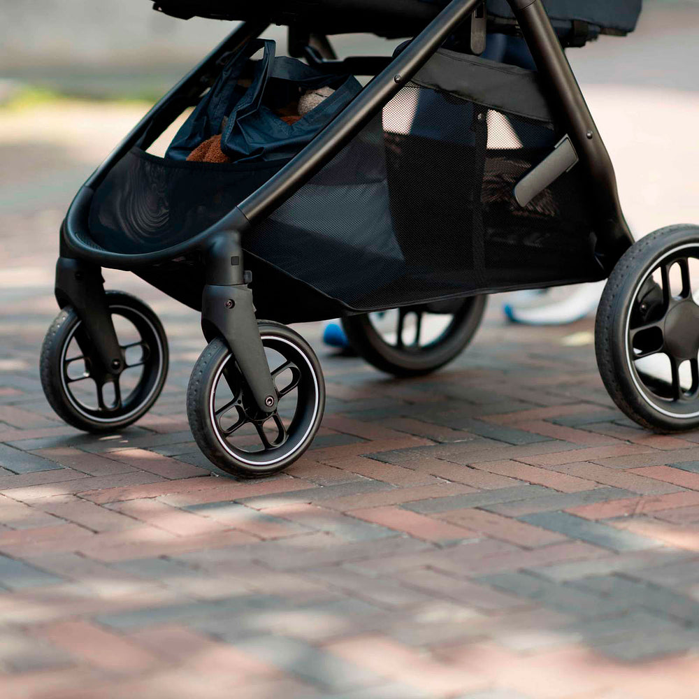Para proporcionar um passeio suave e seguro para os pequenos, o carrinho de bebê tem absorção de impacto e suspensão nas quatro rodas, sendo elas, inclusive, à prova de furos. Ele também possui cinto de cinco pontos para assegurar a proteção das crianças nos passeios rotineiros com a família.